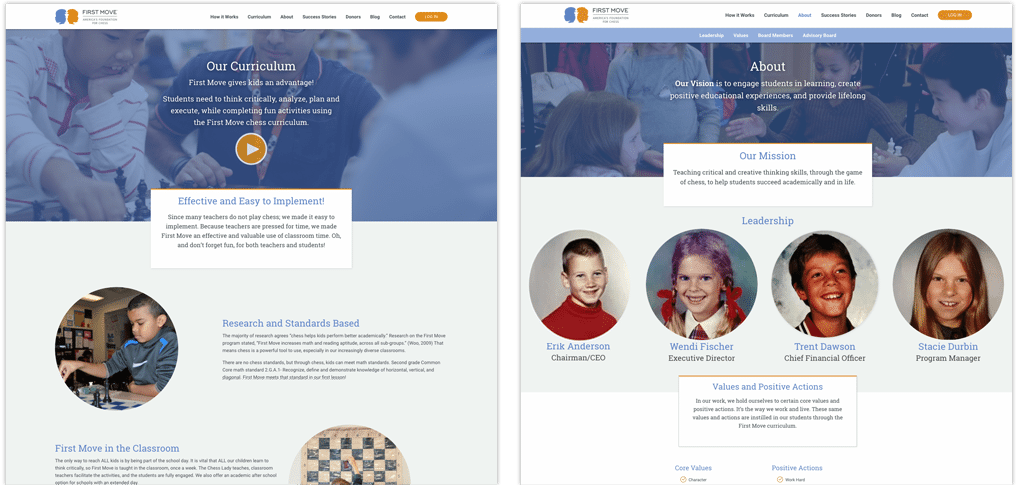 First Move: America’s Chess Foundation (AFC) has just one crazy goal – get underprivileged kids excited about school and thinking critically through learning and playing chess in class. AFC knows there’s no time like early childhood to mold the way someone thinks and set their maximum cognitive ability, so they needed to sell their curriculum to inner city schools for their 2nd grade classes. However, the problem was that the foundation’s website failed to communicate the value of its curriculum, and its stock imagery didn’t represent anything like the diversity of its target audience. That’s where Sayenko Design entered the scene.