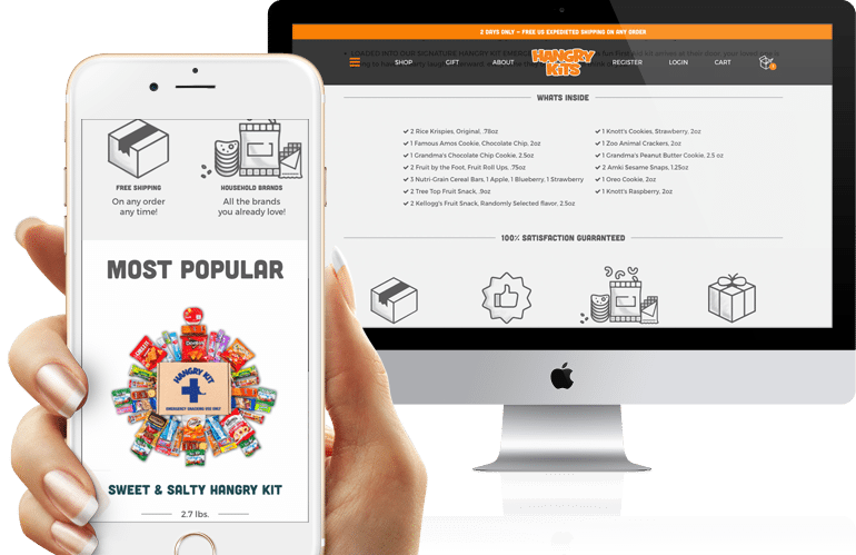 Hangry Kits has been delivering a variety of boxed snack packages to hungry customers since 2011. After significant growth on Amazon and Ebay, the client sought to establish an ownable selling platform that would allow them to sell direct to consumers. Doing so would improve the customer experience and increase business value. However, developing a website brought new challenges: the need to solidify Hangry Kits as a brand, creating functional ecommerce design, and building awareness to a new online destination.