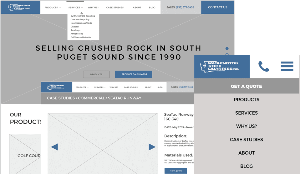 To better understand Washington Rock Quarries website goals we created wireframes and worked through defined user tasks and scenarios, from product inquiry to presentation and explanation of services.